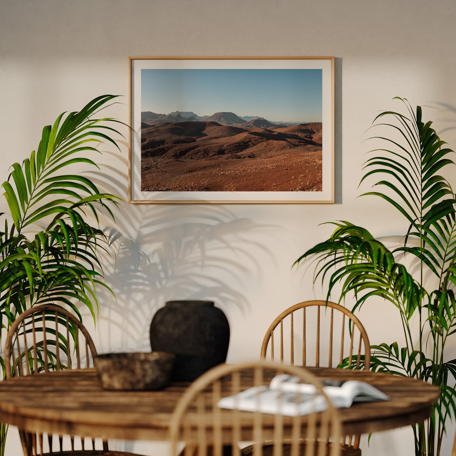 Horizontal landscape photograph of a solitary desert tree against blue sky and rust-colored dune in a natural wood frame with white mat, hung on a cream wall above a wooden dining table, styled with potted palm plants flanking the composition and dining chairs visible below.
