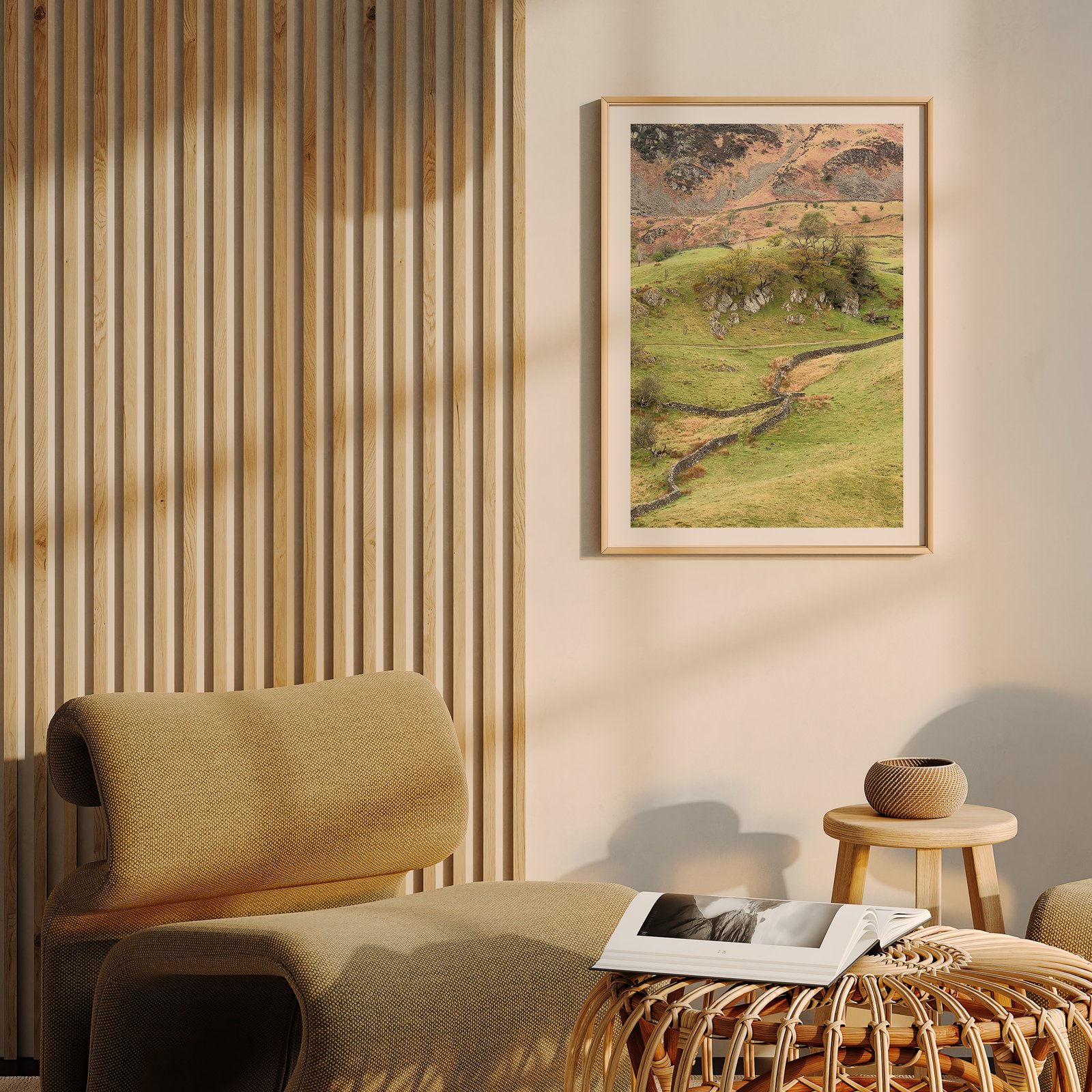 Vertical landscape photograph of a gradient sunset sky and silhouetted landscape in a natural wood frame, hung on a cream wall with wooden slat paneling visible to the side, above a golden-yellow upholstered chair with a woven wooden side table and magazines displayed below.