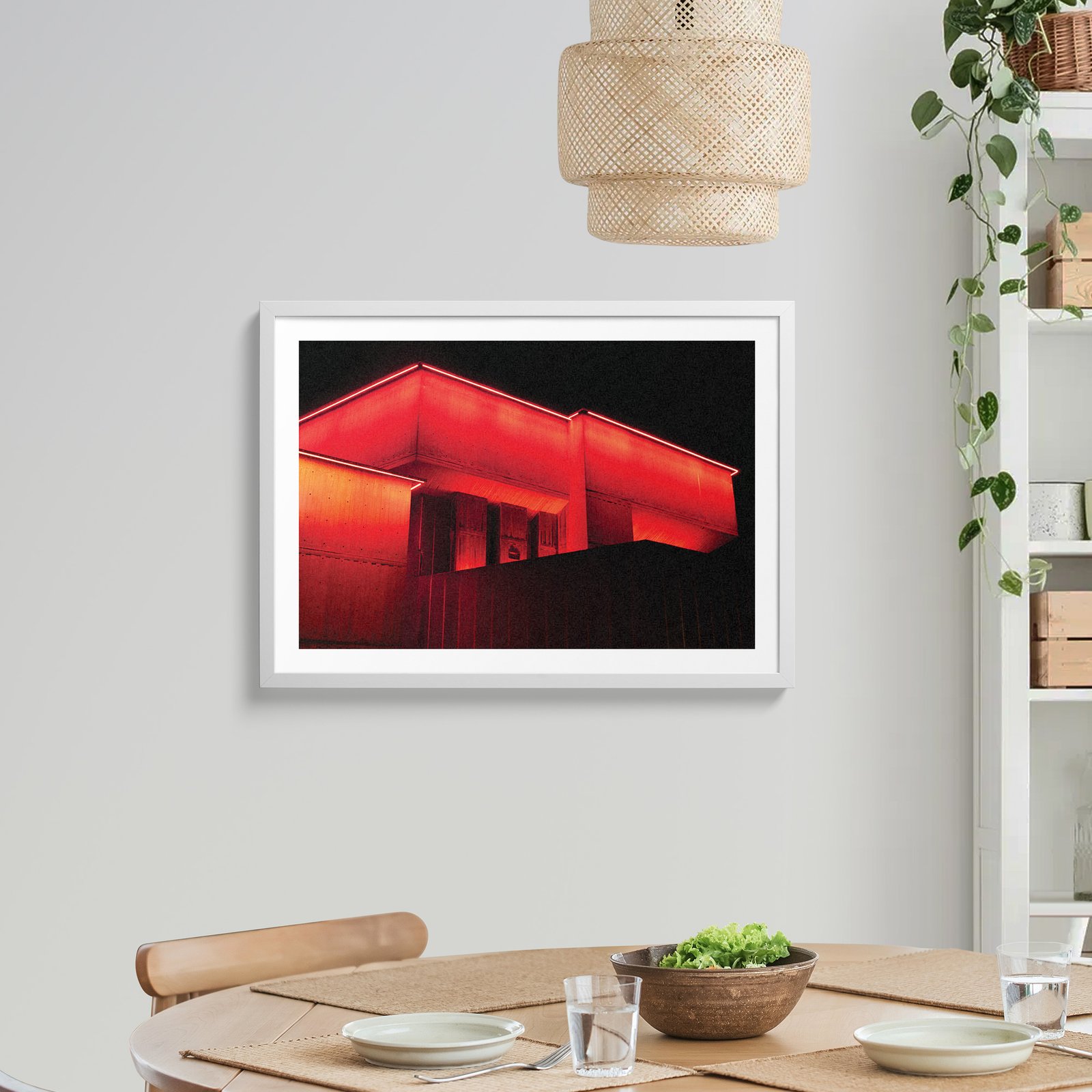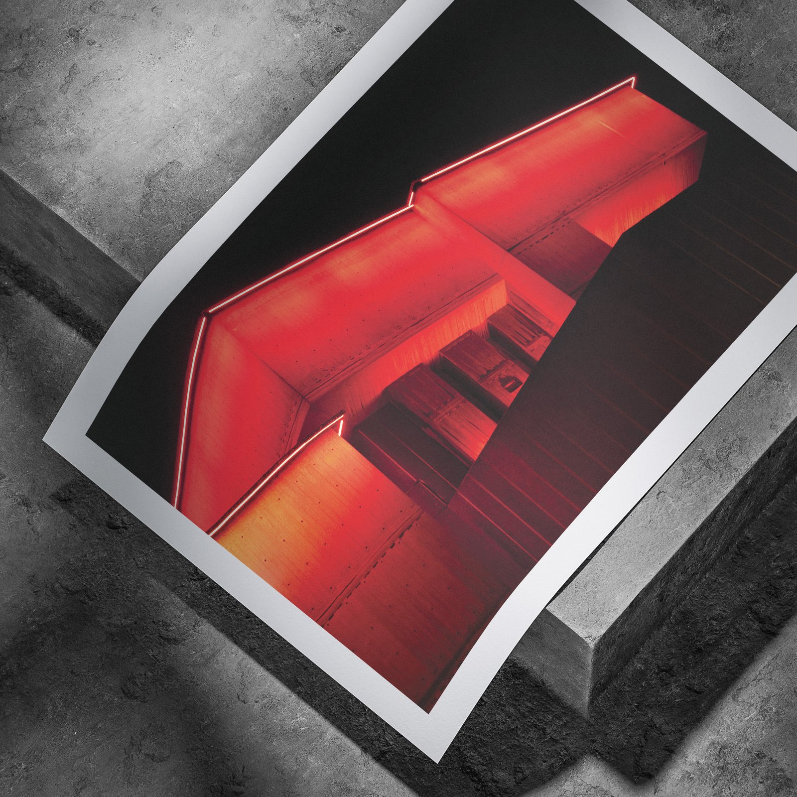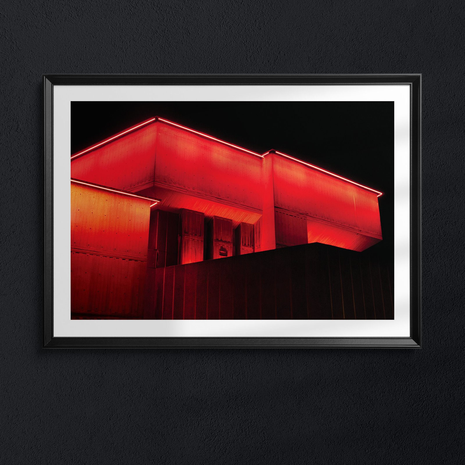 The Southbank Centre blazes against the London night in this bold architectural fine art photograph. Dramatic red illumination transforms the iconic Brutalist concrete into something almost otherworldly, while crisp neon lines trace the building’s angular geometry against the absolute black of the sky beyond.