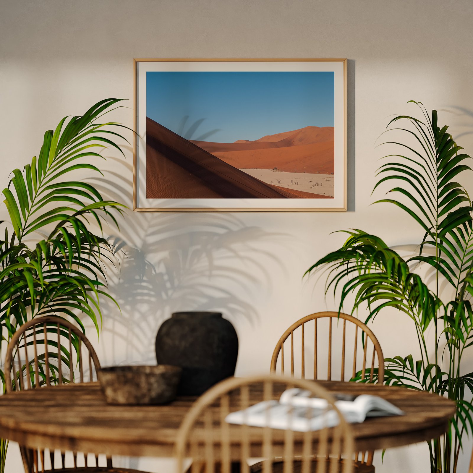 Horizontal landscape photograph of a solitary desert tree against blue sky and rust-colored dune in a natural wood frame with white mat, hung on a cream wall above a wooden dining table, styled with potted palm plants flanking the composition and dining chairs visible below.