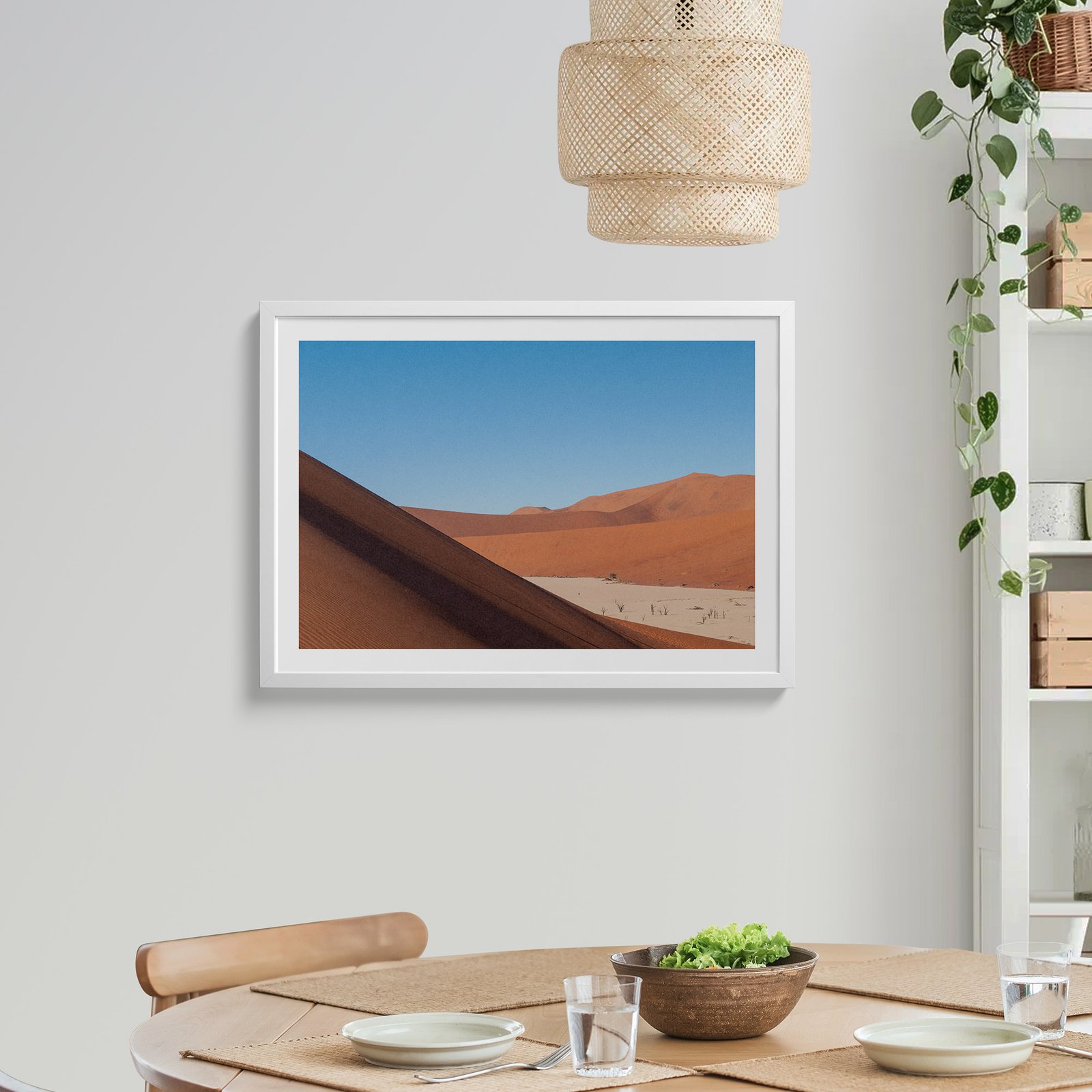 Horizontal aerial landscape photograph in a white frame with white mat, hung on a light wall above a wooden dining table, styled with a rattan pendant light above, trailing ivy plant to the side, and table settings below.