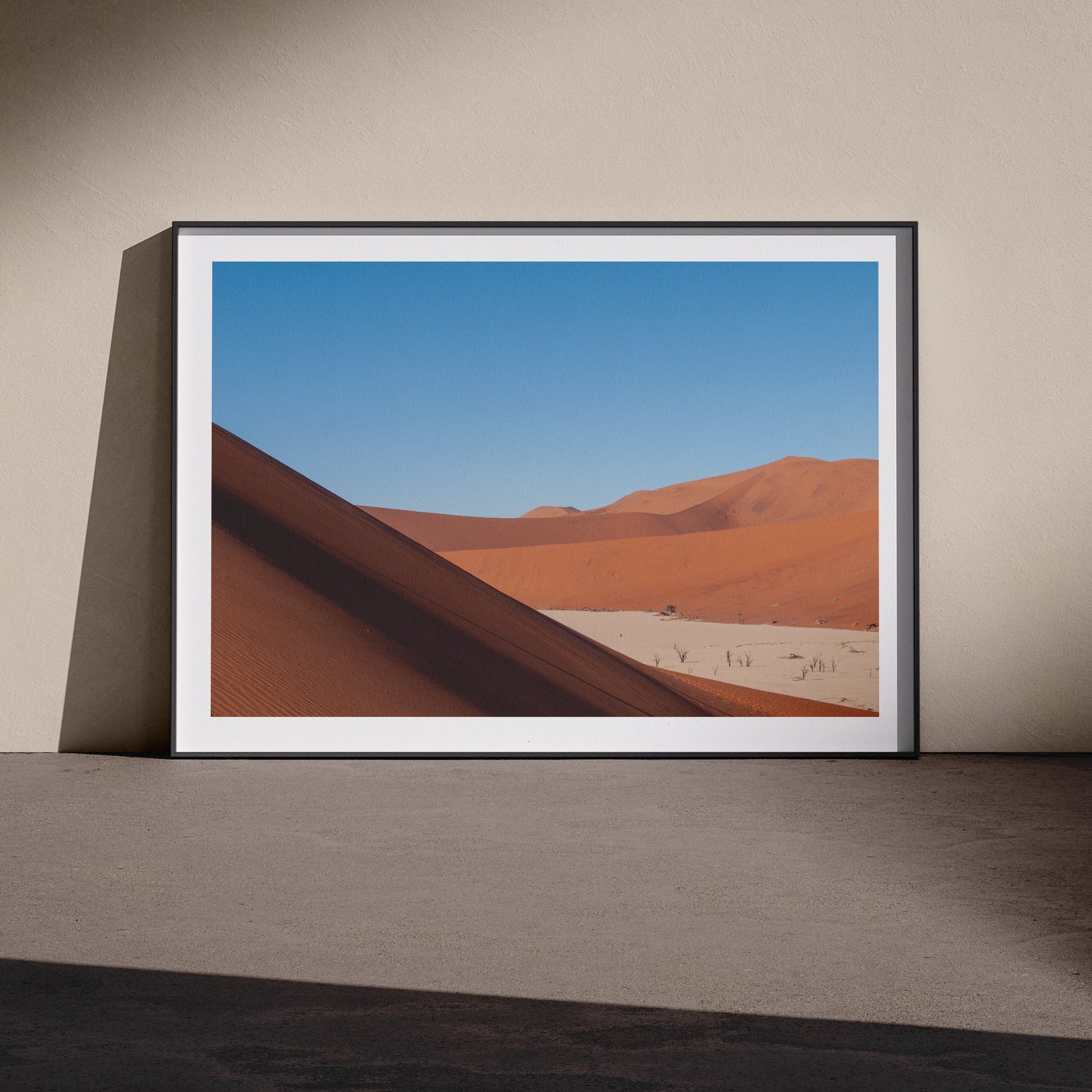 Vertical landscape photograph of a Deadvlei dead tree silhouetted against clear blue sky and terracotta dune in a white frame with dark shadow mat, leaning against a pale wall in a gallery-style floor presentation, lit with soft studio lighting.