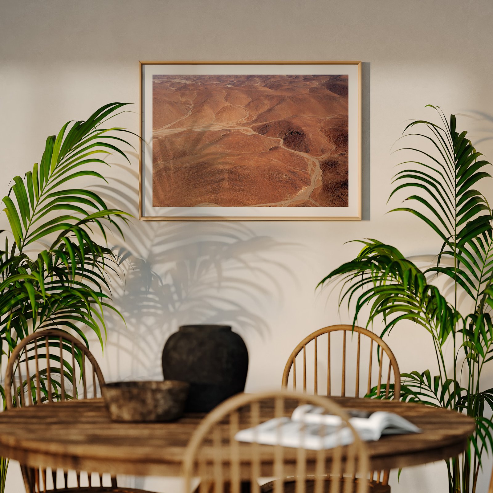 Horizontal landscape photograph of a solitary desert tree against blue sky and rust-colored dune in a natural wood frame with white mat, hung on a cream wall above a wooden dining table, styled with potted palm plants flanking the composition and dining chairs visible below.