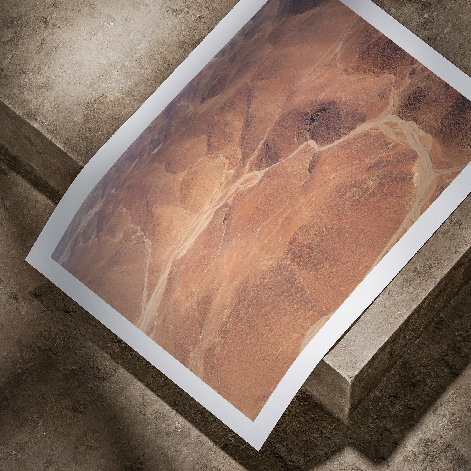 Horizontal landscape photograph of a Namibian sand dune with clear blue sky and terracotta slopes printed on white paper, displayed in a curved, rolled perspective on a concrete surface with dramatic angled lighting highlighting the print edges.