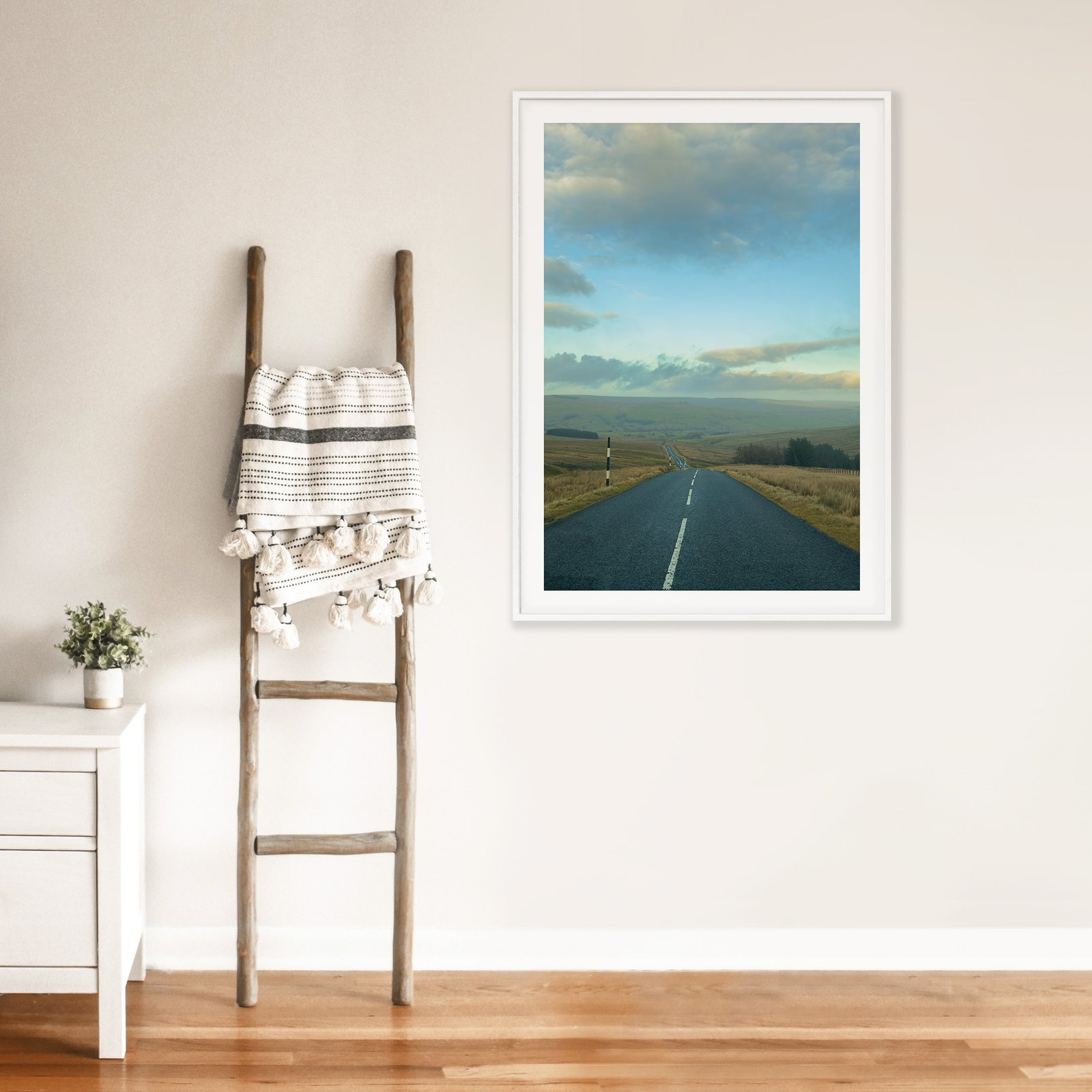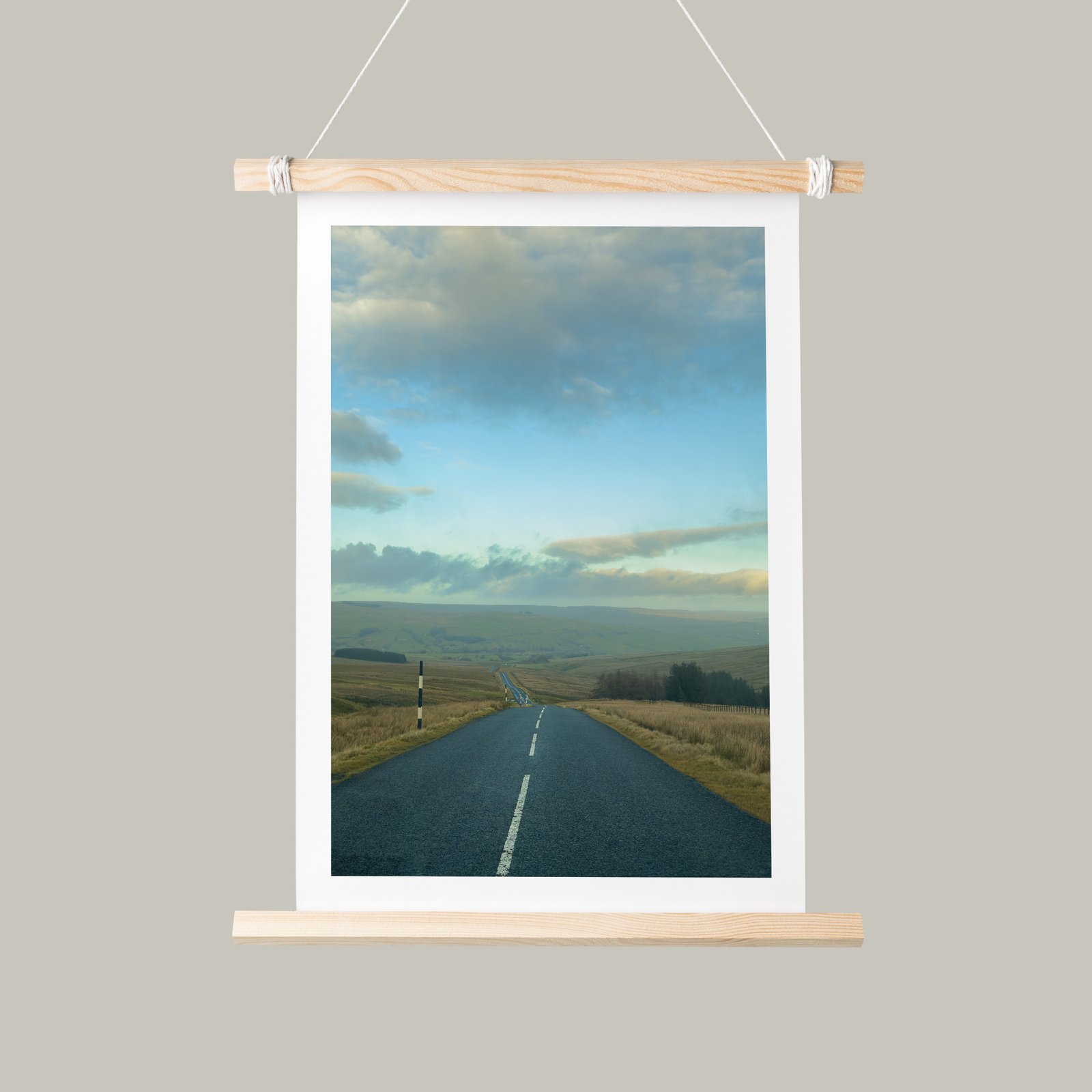 A single white line leads the eye toward infinite possibility across the windswept moors of the North Pennines. This evocative fine art photograph captures the essence of British upland landscape, where empty roads traverse vast expanses of heather and rough grass beneath ever-changing northern skies.