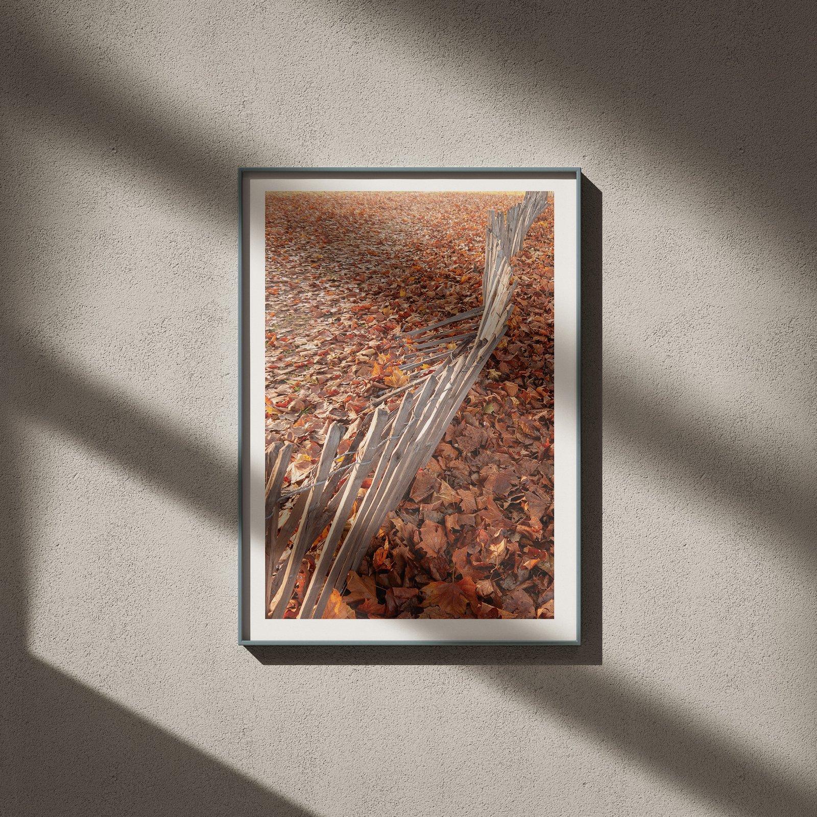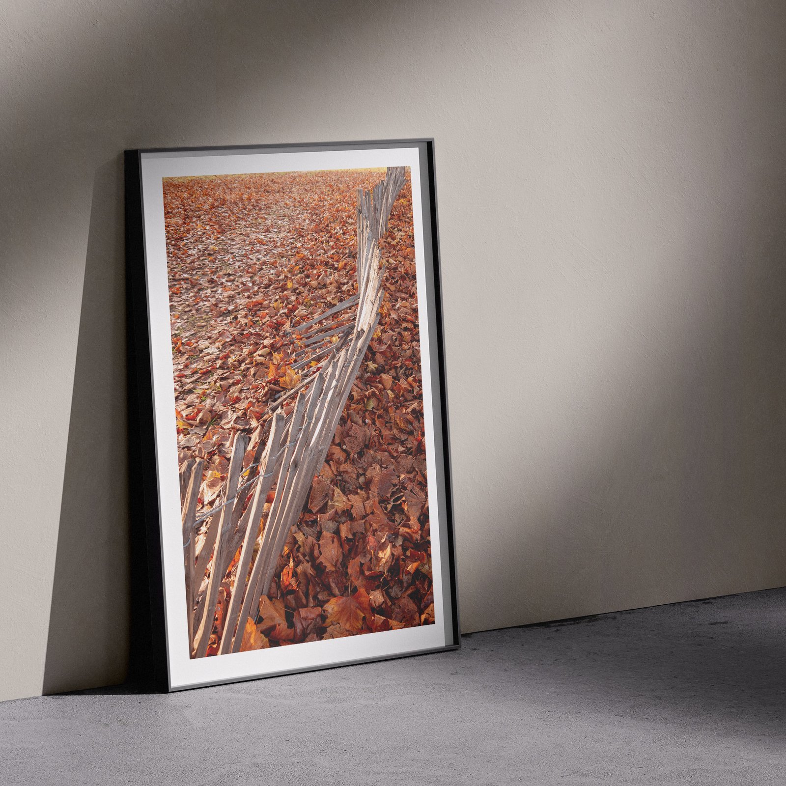The composition uses strong diagonal perspective to draw the viewer into the image. The fence leads the eye from the immediate foreground deep into the distance, where the leaf carpet continues toward a suggestion of pale winter grass beyond. This sense of depth transforms what might be a simple study into a journey through the frame.
