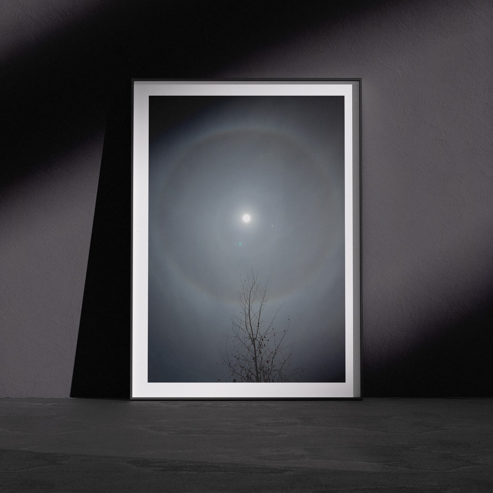 A luminous ring encircles the winter moon in this rare and atmospheric fine art photograph from London. The 22-degree halo, formed by ice crystals suspended in high cirrus cloud, creates a perfect circle of refracted light that seems to hold the moon at its centre like a jewel in a celestial setting. Below, the delicate silhouette of a bare tree reaches upward as if in wonder.