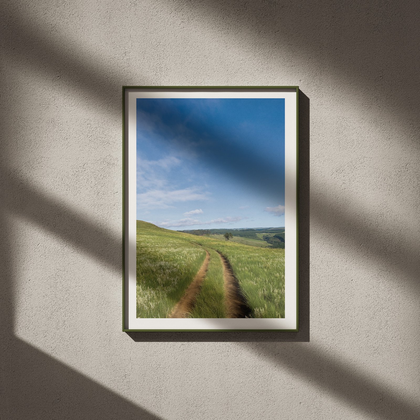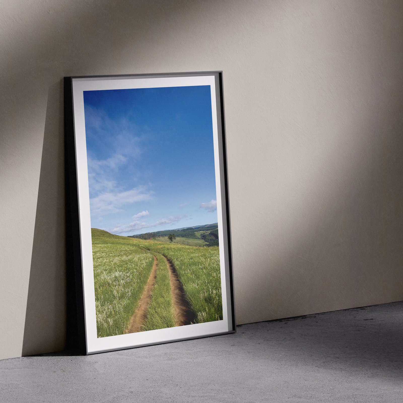 Twin tracks wind through a meadow of white wildflowers toward distant rolling hills in this peaceful fine art photograph from South Africa’s KwaZulu-Natal province. The image radiates pastoral tranquillity, inviting viewers to follow the gentle curve of the path toward the lone tree that stands sentinel on the horizon.