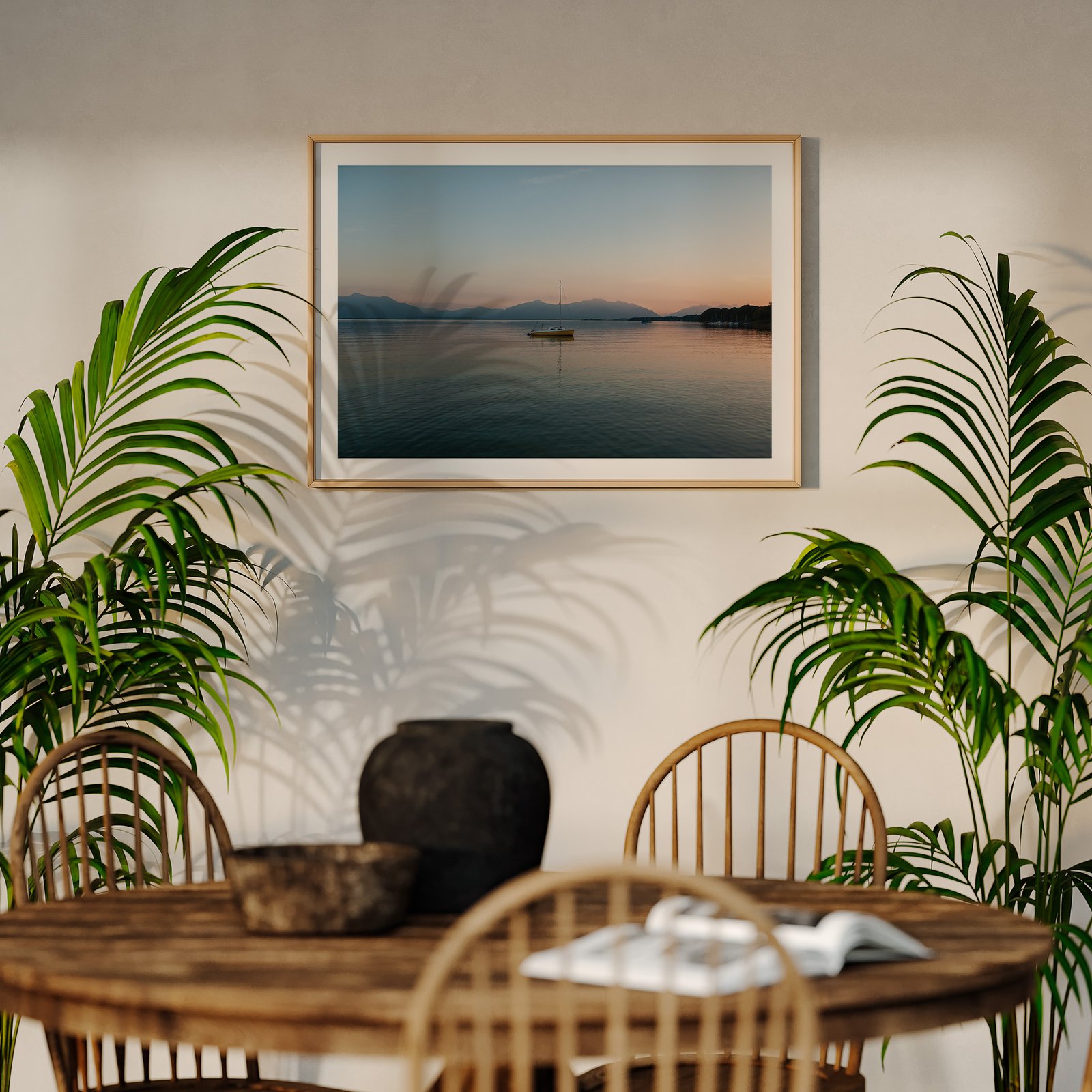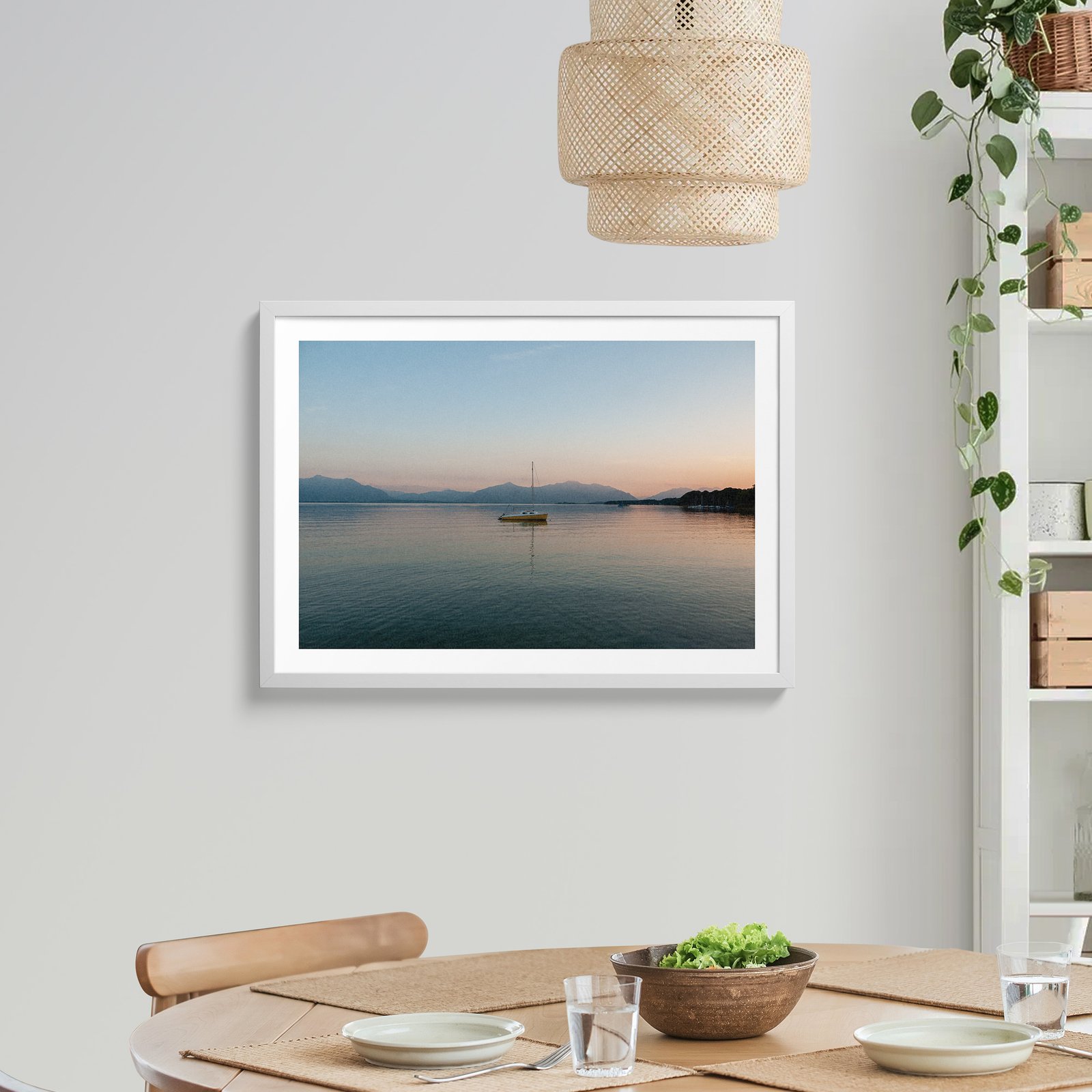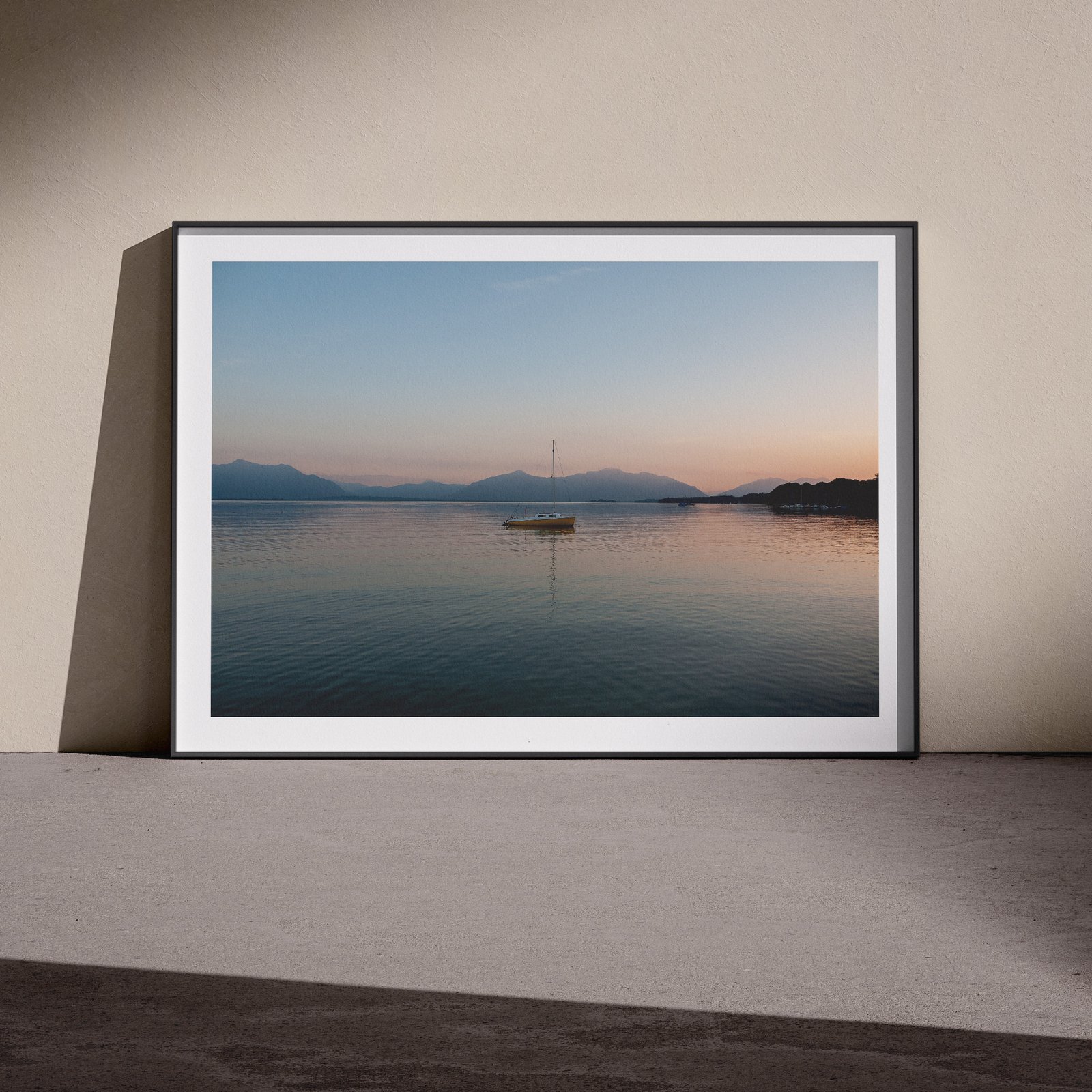 A lone yacht rests at anchor on glass-still water as evening descends over the Bavarian Alps. This tranquil fine art photograph captures a moment of perfect calm, the boat’s reflection stretching downward into depths that mirror the soft gradients of a fading sky. It is an image that invites the viewer to breathe more slowly, to pause and simply be.